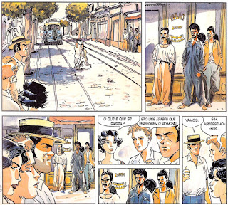 Nascido em 1955 na Argélia (tal como Camus) ao nível do argumento a obra de Ferrandez mistura livros com outros autores, incluindo adaptações de nomes tão diferentes como Daniel Pennac ou Marcel Pagnol, com trabalhos próprios focando sobretudo a história colonial da Argélia, como a premiada série “Carnets d’Orient”. O interesse em Camus é pois natural, e Ferrandez já antes adaptara a história curta “L’Hôte” (2009). Do ponto de vista do desenho o ambiente luminoso de ambos os lados do Mediterrâneo transformam o traço clássico do autor, tornando-o imediatamente reconhecível, quer em banda desenhada, quer nos seus cadernos de viagem. Em “O estrangeiro” a cor em registo de aguarela é utilizada de forma muito interessante, oscilando entre o diáfano e o opressivo, e mantendo um tom de permanente distanciamento, quer do leitor em relação ao protagonista, quer deste em termos de todo o meio envolvente, de Argel ao deserto.